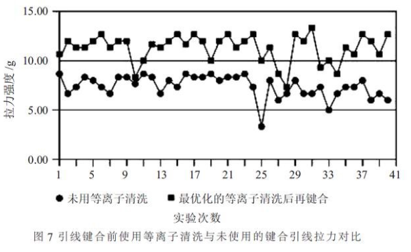 (2)引線鍵合前。芯片粘貼到基板上后,經過高溫固化,其上存在的污染物可能包含有微顆粒及氧化物等,這些污染物從物理和化學反應使引線與芯片及基板之間焊接不完全或粘附性差,造成鍵合強度不夠。在引線鍵合前進行射頻等離子清洗,會顯著提高其表面活性,從而提高鍵合強度及鍵合引線的拉力均勻性。鍵合刀頭的壓力可以較低(有污染物時,鍵合頭要穿透污染物,需要較大的壓力),有些情況下,鍵合的溫度也可以降低,因而提高產量,降低成本。